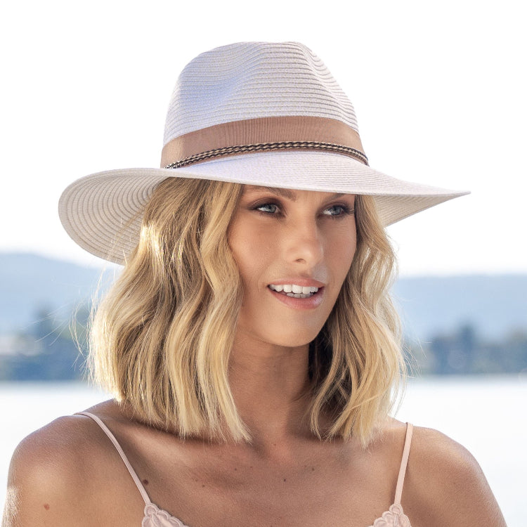 The Tina M Copenhagen Bahama Fedora in Ivory/Nutmeg combines sophisticated style with practical features. Crafted from Ivory Flexibraid®, this wide-brim hat offers UPF50+ sun protection, making it ideal for sunny holidays. Its unique grosgrain and double cord trim add refined detail, while the flat packable and water-resistant design ensures convenience and durability. An internal ComfyFit adjustment guarantees a secure, comfortable fit throughout your adventures.