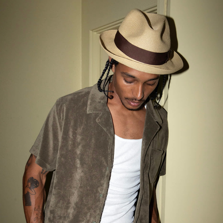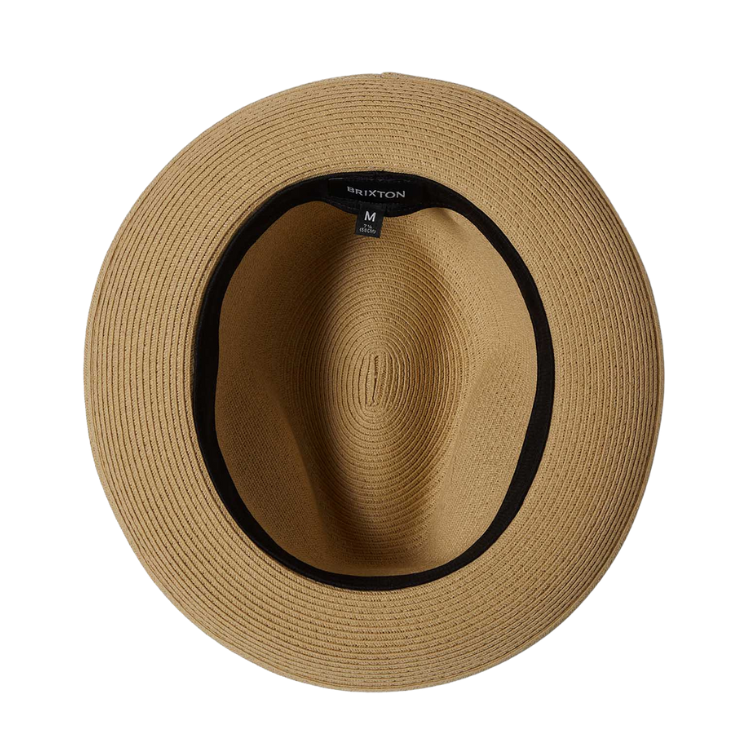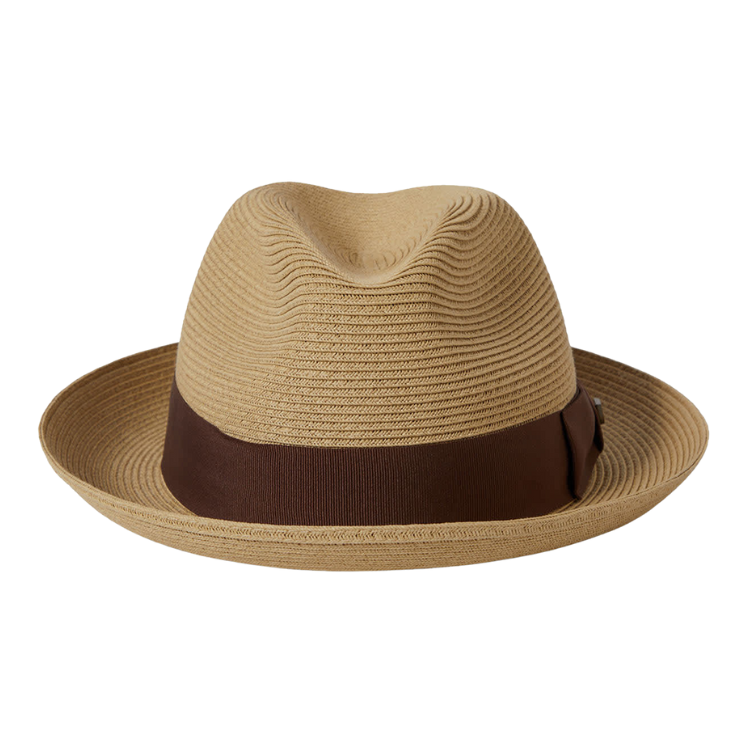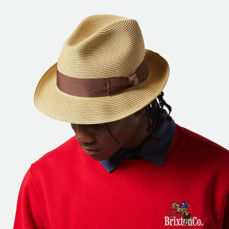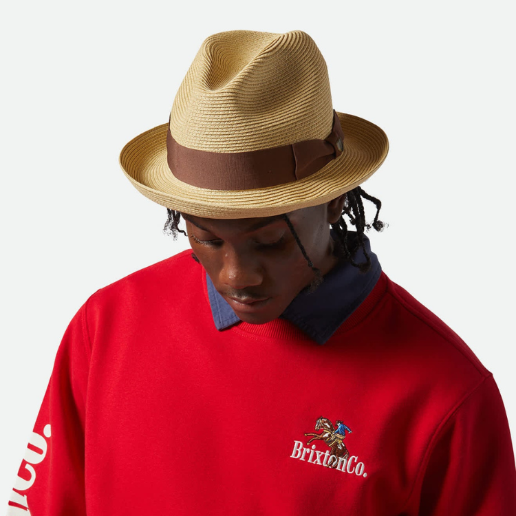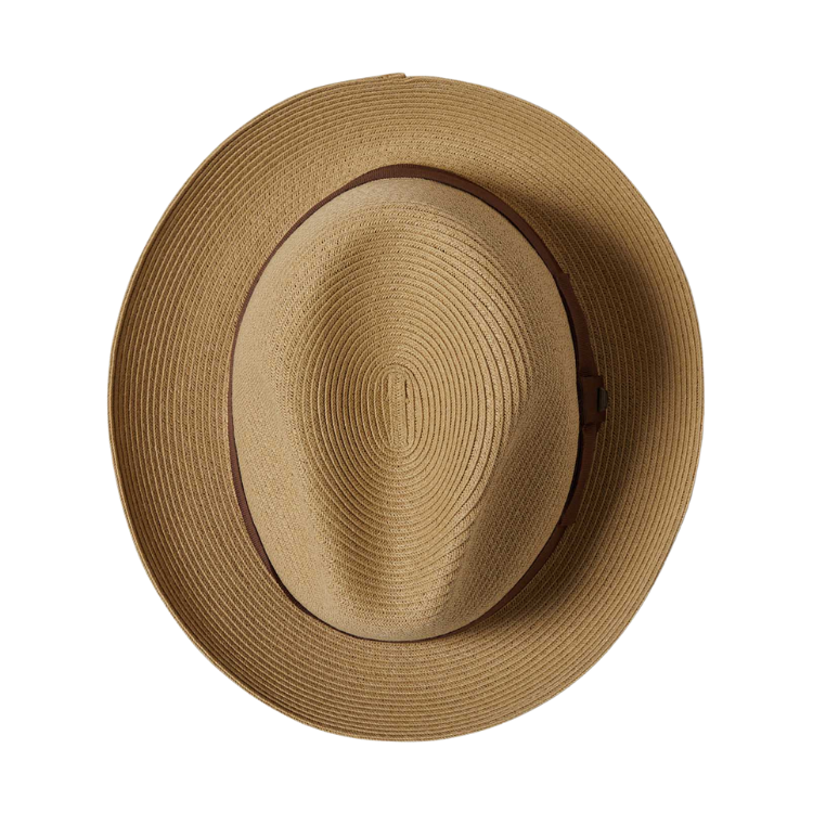 Travel in style with the Brixton Horton CB Packable Fedora, where vintage charm meets modern convenience. This lightweight paper straw fedora flips between a classic down brim and a cheeky upturned look, letting you switch up your vibe on the fly. The teardrop crown and grosgrain band channel 1920s sophistication, while the warm dark tan and light brown tones work with virtually any outfit. Adjustable Velcro sweatband keeps it snug and comfy, and here's the best bit—it folds flat for packing without losing its shape. Topped with a metal crest pin for that extra dash of flair, this unisex fedora is your go-anywhere companion for adventures big and small.