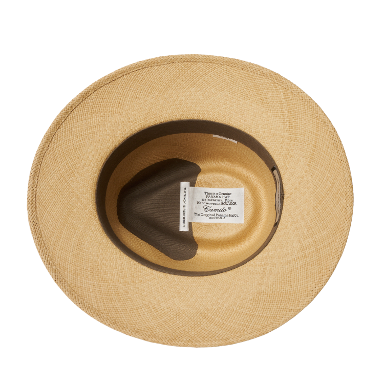 The Camilo Panama Executive Natural features a deep, teardrop crown designed to fit a wide range of head shapes comfortably. Crafted with triple-blocking and stiffening techniques, this safari-style fedora maintains its shape over time, even with frequent use. Reinforced for durability, it combines classic style with lasting performance, making it an excellent choice for those seeking both elegance and resilience in a fine-grade Panama hat.