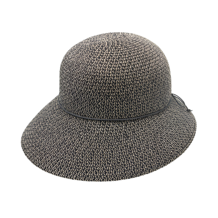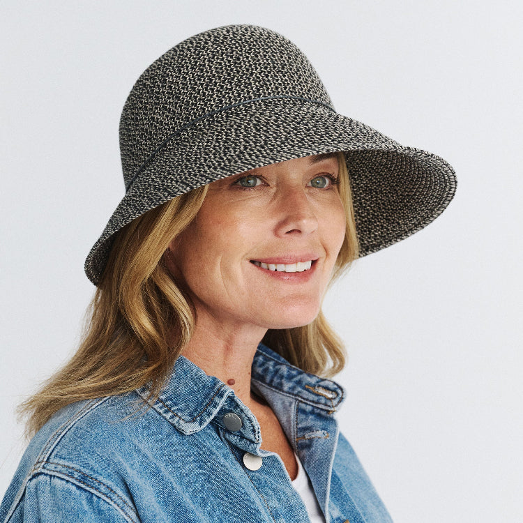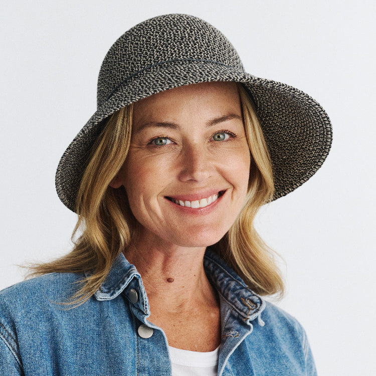 The Cancer Council Ora Bucket in Charcoal combines style and sun safety with its UPF50+ protection. Crafted from a blend of polyester and natural fibres, this bucket hat features an asymmetrical brim measuring 10cm to 6cm and an 11cm crown for a modern silhouette. A tonal cord tied in a delicate bow at the back adds a subtle, feminine touch, while the ComfyFit adjuster ensures a secure, comfortable fit. Ideal for those seeking both practicality and elegance in sun protection.