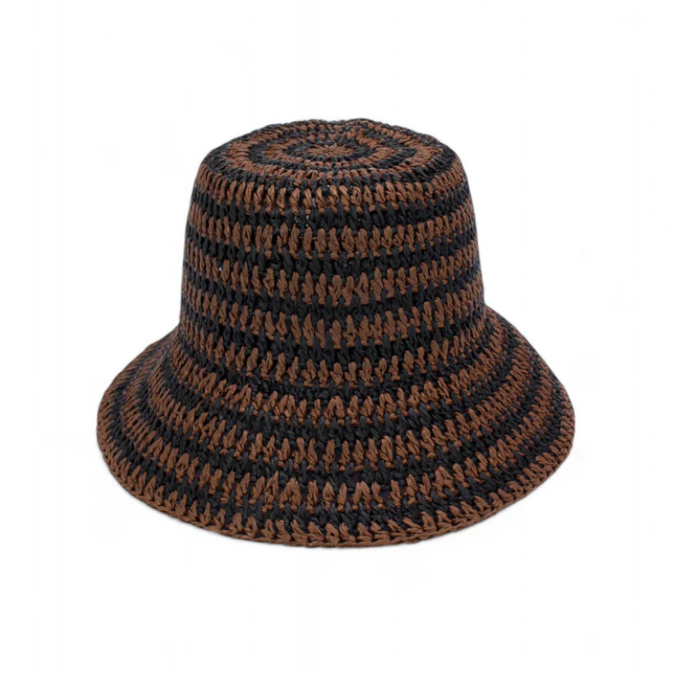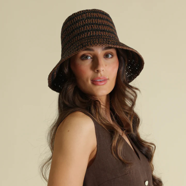 The Morgan & Taylor Delphine Bucket Hat in brown combines style with practicality. Made from 100% paper weave with a structured bucket shape and contrasting stripe detail, it offers sun protection and a comfortable fit with an adjustable internal strap. Perfect for any occasion, from casual to elegant.