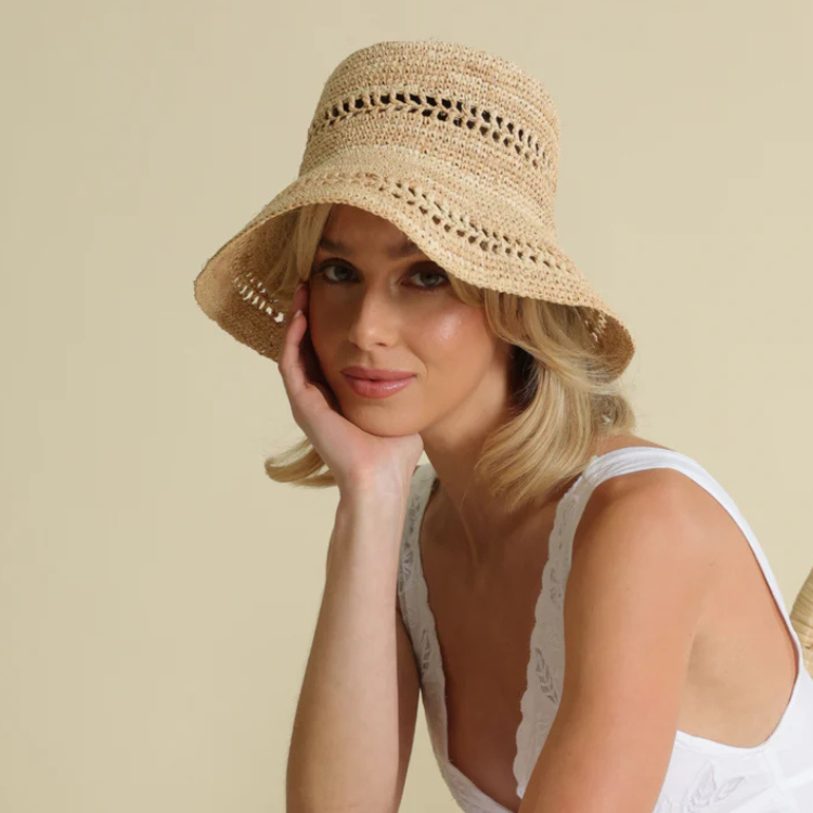 The Morgan & Taylor Naia Crochet Bucket Hat brings understated elegance to any wardrobe. Crafted from tightly woven 100% raffia straw, this structured bucket hat delivers a polished silhouette with refined detail—a subtle contrast stitch traces the crown and brim for visual interest. Versatile enough to elevate a luxe ensemble or provide practical sun protection for everyday wear, it's the effortless piece you'll reach for again and again. An internal adjustable strap ensures a secure, comfortable fit all day long.