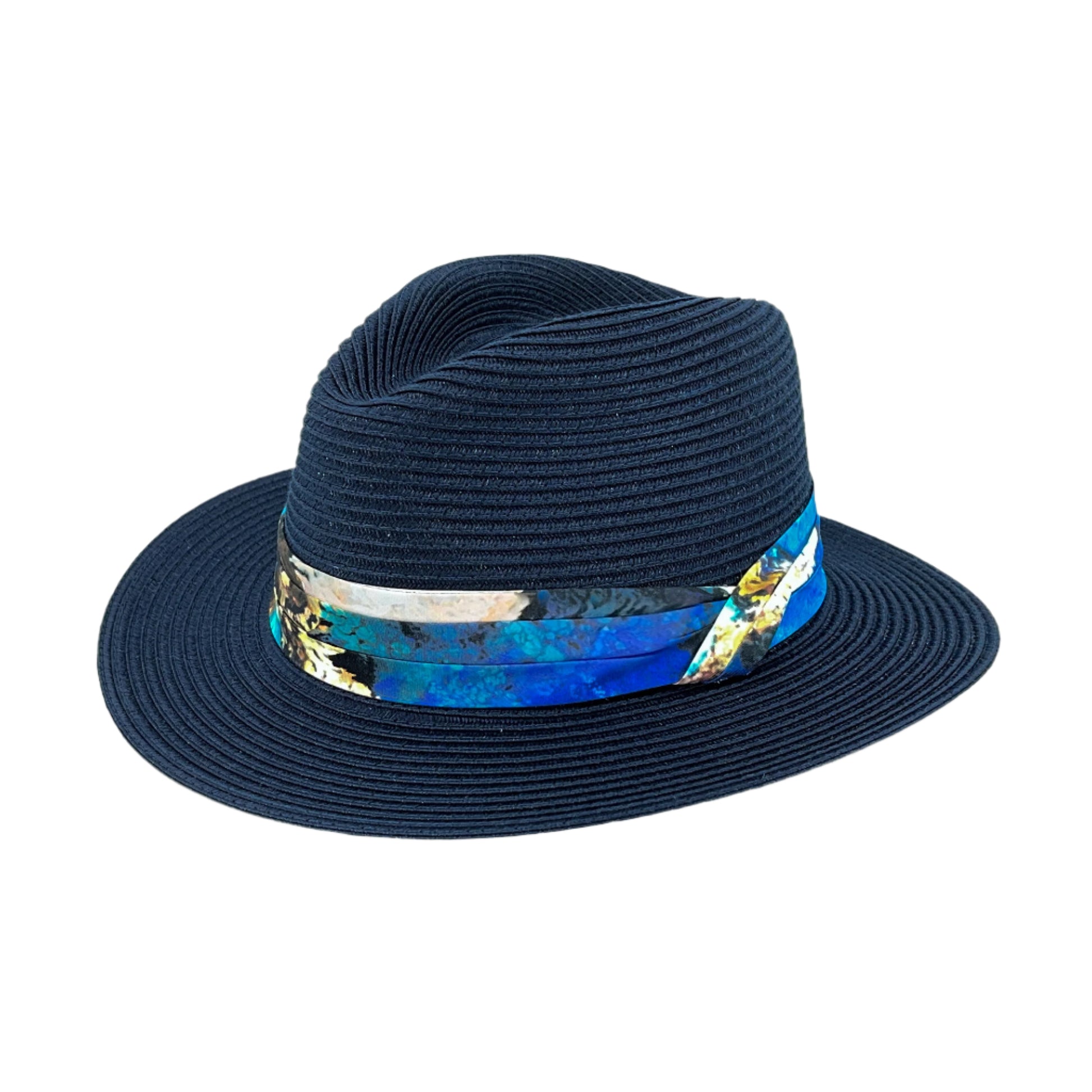 Made from durable Navy Flexibraid®, this fedora is designed for travel and everyday wear, featuring UPF50+ sun protection and an adjustable ComfyFit interior for exceptional comfort. A distinctive puggaree twist adorns the side of the crown, blending artistic detail with practical sun-smart design in a classic silhouette. The crown measures 9.5cm, and the brim is 7.5cm.