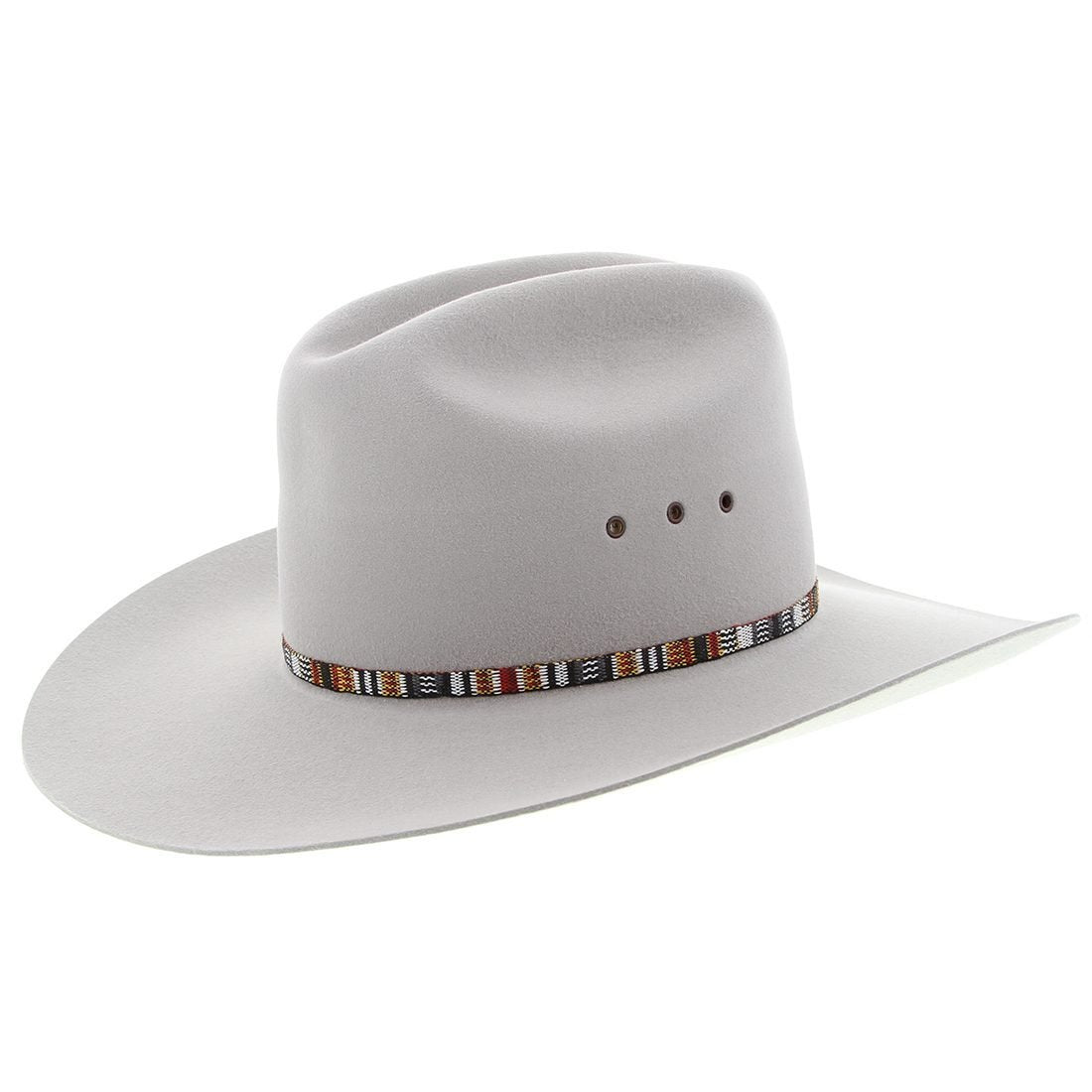 The Bronco, an iconic Australian western hat by Akubra, features a stylish embroidered hatband with the brand's signature bronze logo. With Aztec-inspired band and contrast-colour eyelets, this smart, high crowned hat is ideal for both work and dress. It is crafted from Imperial Quality pure rabbit fur felt for strength and durability, and includes a fully lined and Reeded roan leather sweatband.