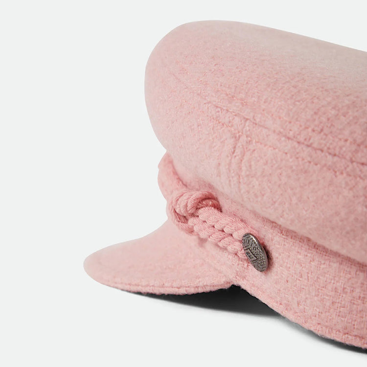 Drawing inspiration from 1950s classic fisherman's caps, the Brixton Kayla Cap in Soft Pink Boucle combines timeless style with modern comfort. Crafted from a durable blend of 80% polyester and 20% wool, this cap features a soft boucle texture that adds subtle sophistication. The braided rope band detail and metal crest pin enhance its authentic vintage appeal, making it a refined choice for those seeking heritage-inspired headwear with lasting quality.