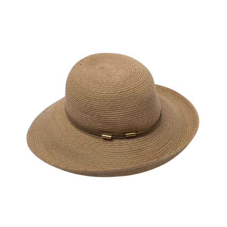 The Hamilton is a signature style from Deborah Hutton. The Hamilton is handmade using a unique Madagascan raffia, which is woven into a braid providing UPF50+ sun protection. The design is finished with a 5mm khaki leather rope extending twice around the crown and secured with 2 beautiful brass buckles at the front.