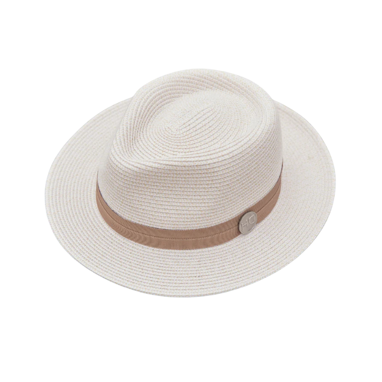 The Pinehurst Fedora, crafted by Deborah Hutton for Canopy Bay, epitomizes elegance in our golf collection. It showcases a magnetic DH ball marker discreetly placed on the side. This refined piece, in a serene Ivory hue, is complemented by a striking grosgrain ribbon and adorned with an antique bronze DH stud. Designed for both practicality and style, it offers UPF50+ sun protection and is meticulously made in Australia.