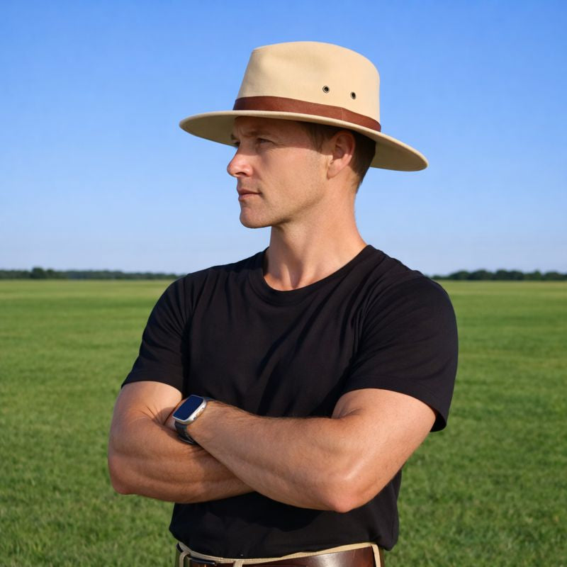 City Safari from GC Hats is a simple yet durable style. The hat consists of strudy brushed cotton, with a thick leather hat band. Featuring two ventilation eyelets on either side of the crown for those hot summer days. This style is perfect for all year round and is your new go-to piece for everyday wear!