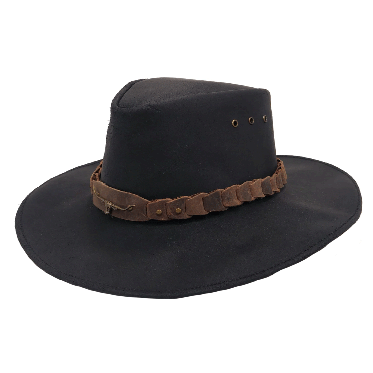 The 'Brumby' Shapeable hat is ideal for those who like to choose their own adventure. Constructed from leather with a linked hatband with bullhorns and rivets. Wear it anyway or anywhere you like as it features a wired brim that allows you to change the shape to how you like. Also featuring the material is water-resistant, so you can wear it anytime throughout the year as you please.