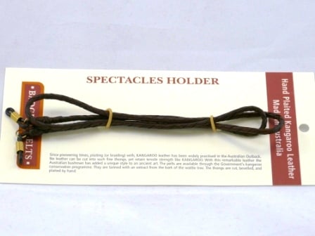 Glasses band to make your life easier!! Hand pleated Roo Leather made right here in Queensland . 67 cm long, 1/4 cm thick. Genuine Roo Leather. Spring Coiled Ends with rubber clasp to ensure a tight fit on any glasses . One size fits all.