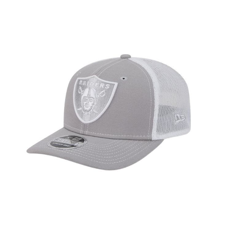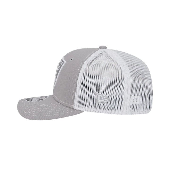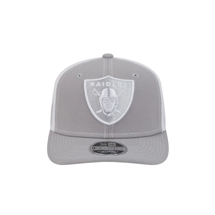 Introducing the new Grey New Era Las Vegas Raiders 9SEVENTY Snapback Trucker. Experience the perfect blend of 9FIFTY and 9FORTY styles in this adjustable cap, featuring a trucker mesh back for added comfort and style. This cap also features 100% Recycled Polyester Material.