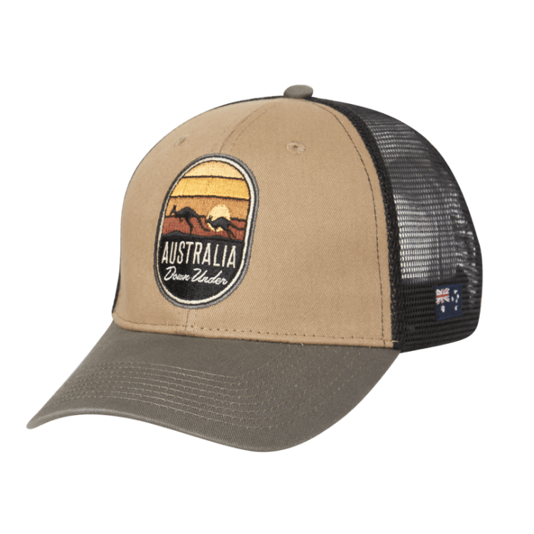 The Pacific Creations Scout Trucker Cap in Taupe features a mesh back, adjustable fastener, and a bold Australian print on the front. Stay protected from the sun while looking stylish with this high-quality cap.