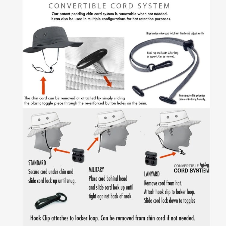 The Shelta Convertible Cord is an essential accessory to the Shelta Hats. It helps to fit any Shelta hat securely. It features two toggles that are to be slide through the re-inforced buttonholes on side of the brim and a large detachable hook clip.