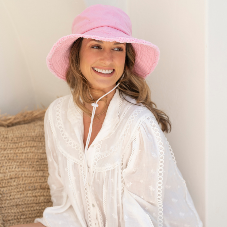 The simple yet stylish Teagan Bucket Hat is made from soft and comfortable cloth fabric with a detachable chin strap. Easy to wear, this piece is the perfect addition to any sun-safe look for beach days, camping or relaxing by the pool.
