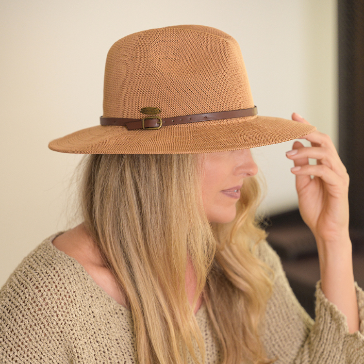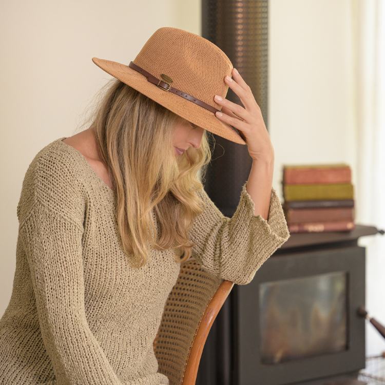 The Sundaise Sutton Panama in caramel is crafted from 100% polyester, making it a lightweight and breathable choice perfect for summer. Featuring an internal adjuster, this hat ensures a comfortable fit with its one size (57cm) design. Its classic panama style offers both sun protection and timeless elegance, ideal for warm-weather outings.