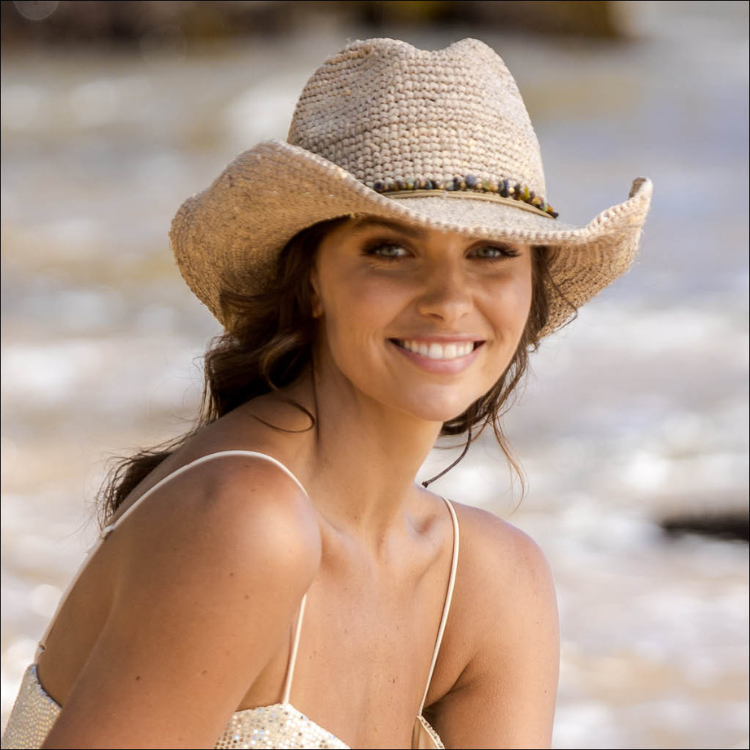 The Dallas cowboy is woven from the finest Madagascan raffia. With a wired brim, you have easy styling options for a wider brim look or a more bohemian cowboy look. The hat band is a combination of tonal beaded stones and multi-strands of fine coated leather cord around the crown.